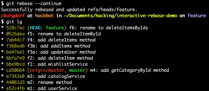 这就是我们想要的,除了f4、f5、f6仍旧缺失。这是因为我们仍在rebase交互的中间,我们需要告诉git继续rebase。用下面的命令继续:git rebase --continue。