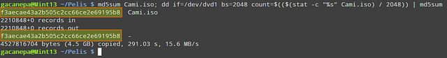 命令的第一部分计算.iso文件的md5校验和,而第二部分则读取/dev/dvd1中的磁盘内容,然后通过管道输出给md5sum工具。“bs=2048”表示dd命令将使用2048字节块为单位检查,因为原始iso文件以2048为单位划分。