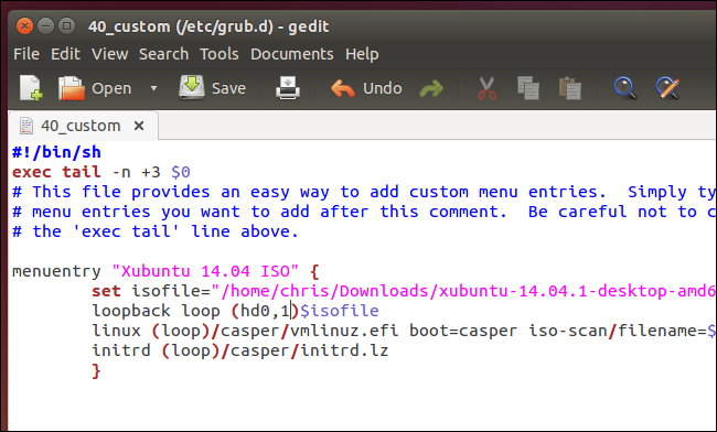 menuentry "Ubuntu 14.04 ISO" { set isofile="/home/name/Downloads/ubuntu-14.04.1-desktop-amd64.iso" loopback loop (hd0,1)$isofile linux (loop)/casper/vmlinuz.efi boot=casper iso-scan/filename=${isofile} quiet splash initrd (loop)/casper/initrd.lz }