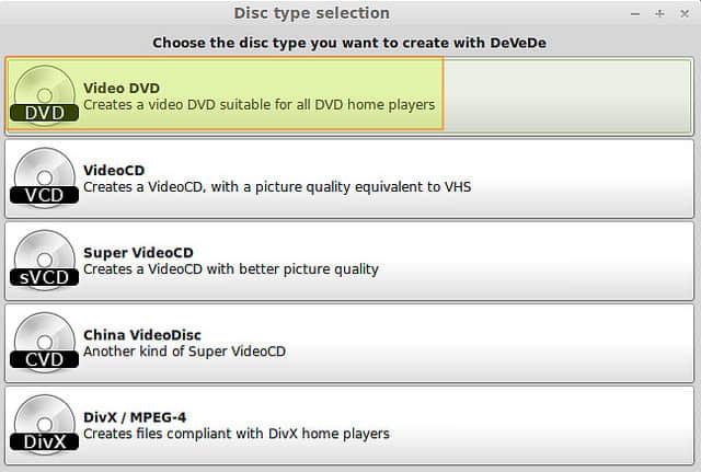 DeVeDe是一个开源(GPLv3)DVD创作软件,它允许你从任何数量的视频文件创建视频DVD、VCD、SVCD或者DivX。DeVeDe依赖于其它如Mplayer、FFMpeg、MEncoder、DVDAuthor、VCDImager以及MKisofs之类的软件来进行格式转换。就这点而论,它支持各种各样的主流输入视频/音频格式(如.mp4,.avi,.mpg,.mkv)。你可以在PAL和NTSC视频格式之间选择,也可以田间菜单或字幕。