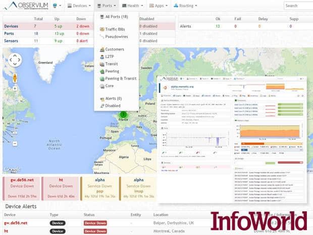 就如我们看到的,Observium也可以在地图上显示任何被监测节点的实际地点。需要注意的是面板上关于活跃设备和警报的计数。