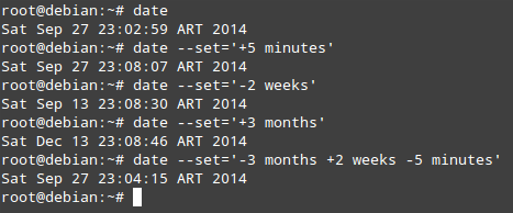 # date --set='+5 minutes' # date --set='-2 weeks' # date --set='+3 months' # date --set='-3 months +2 weeks -5 minutes'