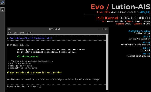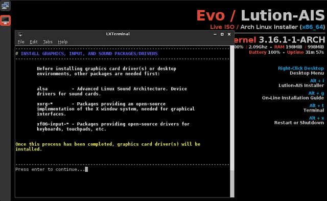 项目的软件部分是命令行安装器Lution-AIS,它负责解释一个普通的纯净的Arch安装过程中的每一步。安装完毕后,你将获得Arch提供的没有从AUR添加任何东西的最新软件或其它任何自定义的包。