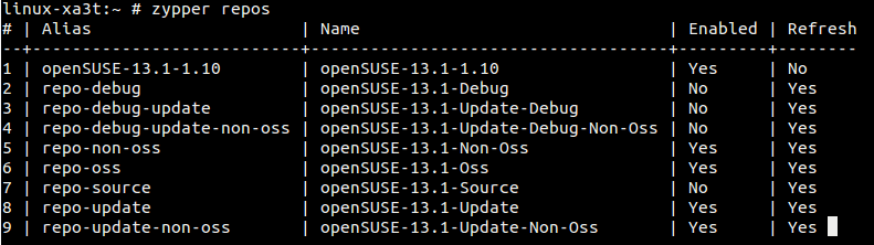 linux-xa3t:~ # zypper ref Repository 'openSUSE-13.1-Non-Oss' is up to date. Repository 'openSUSE-13.1-Oss' is up to date. Repository 'openSUSE-13.1-Update' is up to date. Repository 'openSUSE-13.1-Update-Non-Oss' is up to date. All repositories have been refreshed.