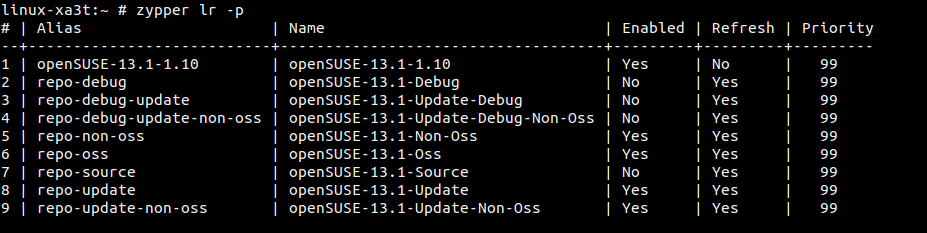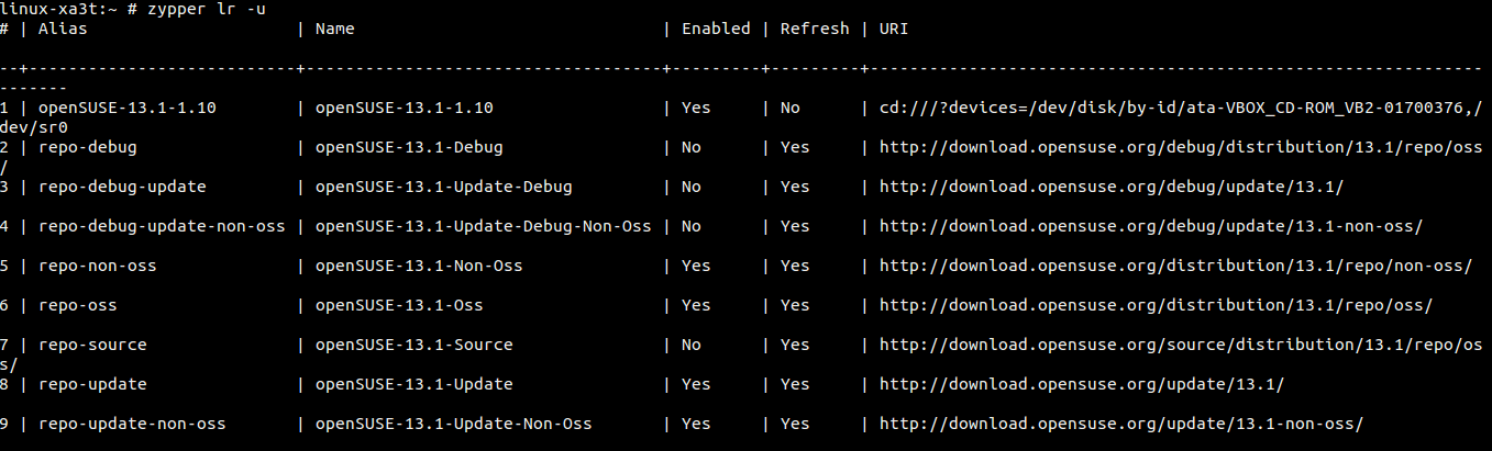 linux-xa3t:~ # zypper ar http://download.opensuse.org/update/13.1/ update Adding repository 'update' .............................................[done] Repository 'update' successfully added Enabled: Yes Autorefresh: No GPG check: Yes URI: http://download.opensuse.org/update/13.1/