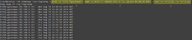 就像上面图片中三个高亮区域描绘的那样,过滤逻辑操作是由三个管道步骤组成的。第一步用于查找由用户gacanepa触发的登录事件([7]);第二步和第三部用于选择期望的字段,移除utmpdump输出的方括号并设置输出字段分隔符为逗号。
