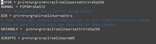 例如,上面的例子说明,NORMAL规则将检查下列属性的不一致性:权限(p)、索引节点(i)、链接数(n)、用户(u)、组(g)、大小(s)、修改时间(m)、创建时间(c)、ACL(acl)、SELinux(selinux)、xattrs(xattr)、SHA256/SHA512校验和(sha256和sha512)。
