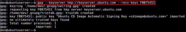 这样做之前,你需要知道公共密钥的 “key ID”,而这在上面的 gpg 命令的输出中有显示。在这个例子中,密钥 ID 时 “FBB75451”。运行下面的命令来从官方 Ubuntu 密钥服务器导入公共密钥。