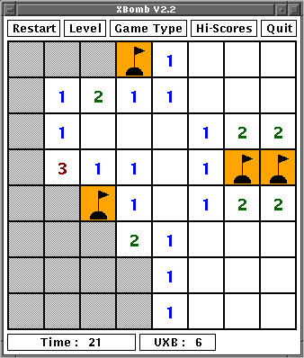 另外一个针对X的图形化扫雷Xdemineur,和Ace-Minesweeper十分相像,带有一个预定义的表尺寸。