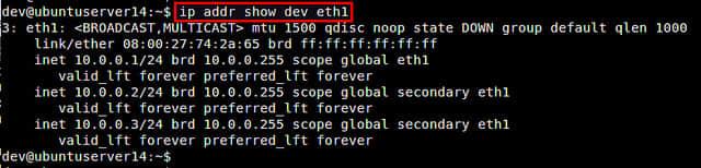 $ sudo ip addr add 10.0.0.1/24 broadcast 10.0.0.255 dev eth1 $ sudo ip addr add 10.0.0.2/24 broadcast 10.0.0.255 dev eth1 $ sudo ip addr add 10.0.0.3/24 broadcast 10.0.0.255 dev eth1