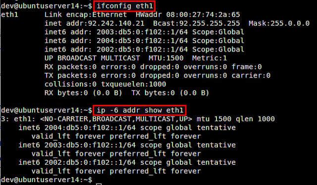 $ sudo ifconfig eth1 inet6 add 2002:0db5:0:f102::1/64 $ sudo ifconfig eth1 inet6 add 2003:0db5:0:f102::1/64