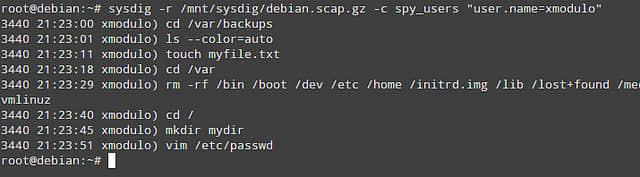 # sysdig -r /mnt/sysdig/debian.scap.gz -c spy_users "user.name=xmodulo"