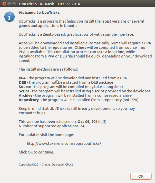 UbuTricks是一个有简单界面,基于Zenity的图形脚本。虽然早期开发中,它的目标是通过简单的界面操作来安装Ubuntu14.04 及以后发行版上应用程序的更新。