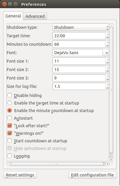 倒计时最大计数为1440分钟(24小时)。配置文件(和日志文件)位于~/.qshutdown,配置文件为:qshutdown.conf。