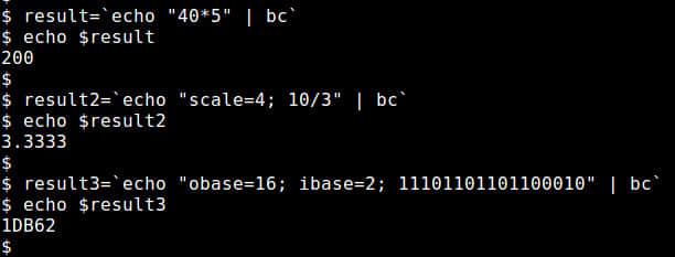 $ echo "40*5" | bc $ echo "scale=4; 10/3" | bc $ echo "obase=16; ibase=2; 11101101101100010" | bc