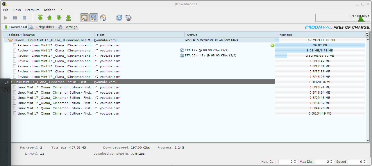 JDownloader简化了从一键下载网站下载文件。它还支持从不同并行资源下载、手势识别、自动文件解压缩以及更多功能。另外,还支持许多“加密链接”网站-所以你只需要复制粘贴“加密的”链接,然后JDownloader会处理剩下的事情。JDownloader还能导入CCF,RSDF和DLC文件。