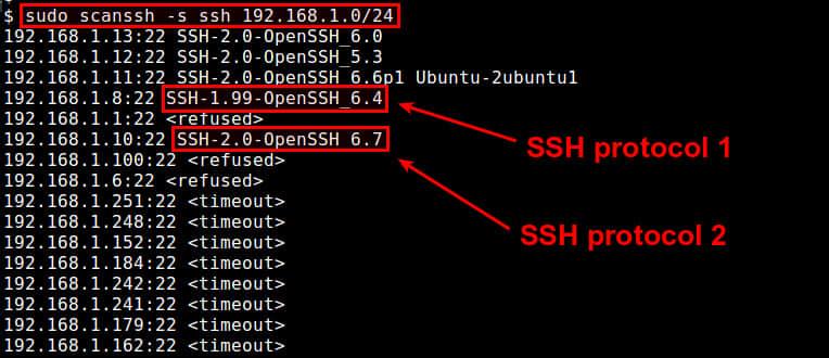 使用下面的命令来发现192.168.1.0/24本地网络中的SSH服务器,并检查SSH协议v版本: