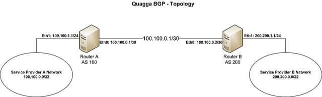 Interface eth0 is up, line protocol detection is disabled Description: "to Router-B" inet 100.100.0.1/30 broadcast 100.100.0.3 Interface eth1 is up, line protocol detection is disabled Description: "test ip from provider A network" inet 100.100.1.1/24 broadcast 100.100.1.255