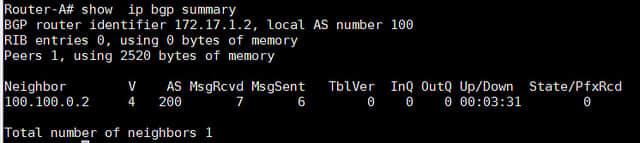 当相关的路由器都被配置好,两台路由器之间的对等将被建立。现在让我们通过运行下面的命令来确认: