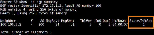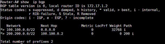在这个例子的输出中,BGP对等只是在AS100和AS200之间呈up状态。因此没有前缀被更改,所以最右边列的数值是0。
