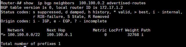 Router-A# show ip bgp neighbors 100.100.0.2 advertised-routes