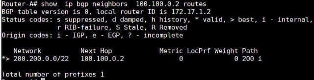 Router-A# show ip bgp neighbors 100.100.0.2 routes