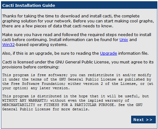 在浏览器中访问 http://你的服务器IP/cacti/install/ 来进行初始化设置,点击 next 下一步