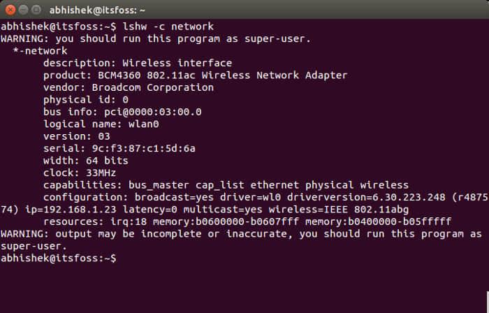 *-network description: Wireless interface product: BCM4360 802.11ac Wireless Network Adapter vendor: Broadcom Corporation physical id: 0 bus info: pci@0000:03:00.0 logical name: wlan0 version: 03 serial: 9c:f3:87:c1:5d:6a width: 64 bits clock: 33MHz capabilities: busmaster caplist ethernet physical wireless configuration: broadcast=yes driver=wl0 driverversion=6.30.223.248 (r487574) ip=192.168.1.23 latency=0 multicast=yes wireless=IEEE 802.11abg resources: irq:18 memory:b0600000-b0607fff memory:b0400000-b05fffff