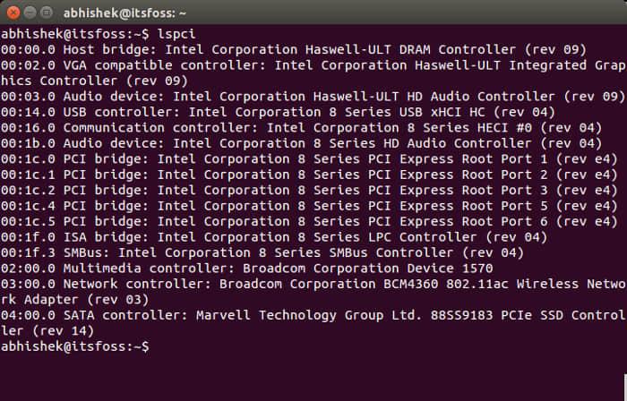 00:00.0 Host bridge: Intel Corporation Haswell-ULT DRAM Controller (rev 09) 00:02.0 VGA compatible controller: Intel Corporation Haswell-ULT Integrated Graphics Controller (rev 09) 00:03.0 Audio device: Intel Corporation Haswell-ULT HD Audio Controller (rev 09) 00:14.0 USB controller: Intel Corporation 8 Series USB xHCI HC (rev 04) 00:16.0 Communication controller: Intel Corporation 8 Series HECI #0 (rev 04) 00:1b.0 Audio device: Intel Corporation 8 Series HD Audio Controller (rev 04) 00:1c.0 PCI bridge: Intel Corporation 8 Series PCI Express Root Port 1 (rev e4) 00:1c.1 PCI bridge: Intel Corporation 8 Series PCI Express Root Port 2 (rev e4) 00:1c.2 PCI bridge: Intel Corporation 8 Series PCI Express Root Port 3 (rev e4) 00:1c.4 PCI bridge: Intel Corporation 8 Series PCI Express Root Port 5 (rev e4) 00:1c.5 PCI bridge: Intel Corporation 8 Series PCI Express Root Port 6 (rev e4) 00:1f.0 ISA bridge: Intel Corporation 8 Series LPC Controller (rev 04) 00:1f.3 SMBus: Intel Corporation 8 Series SMBus Controller (rev 04) 02:00.0 Multimedia controller: Broadcom Corporation Device 1570 03:00.0 Network controller: Broadcom Corporation BCM4360 802.11ac Wireless Network Adapter (rev 03) 04:00.0 SATA controller: Marvell Technology Group Ltd. 88SS9183 PCIe SSD Controller (rev 14)