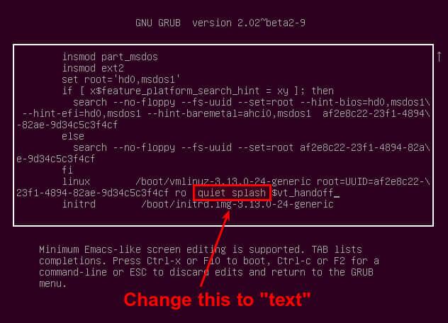 接着会进入下一屏,这里你可以修改内核启动选项。向下滚动到以“linux”开始的行,这里就是内核参数的列表。删除参数列表中的“quiet”和“splash”。在参数列表中添加“text”。