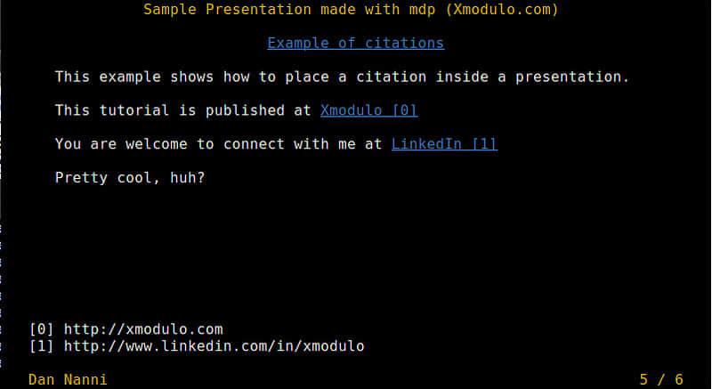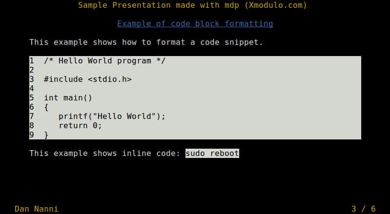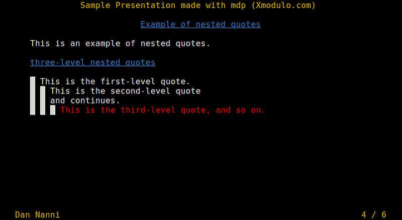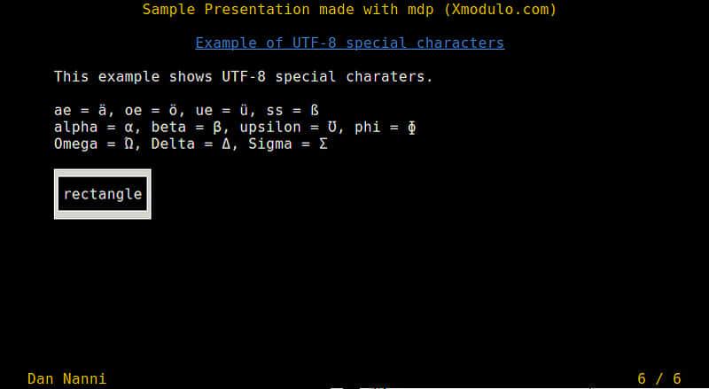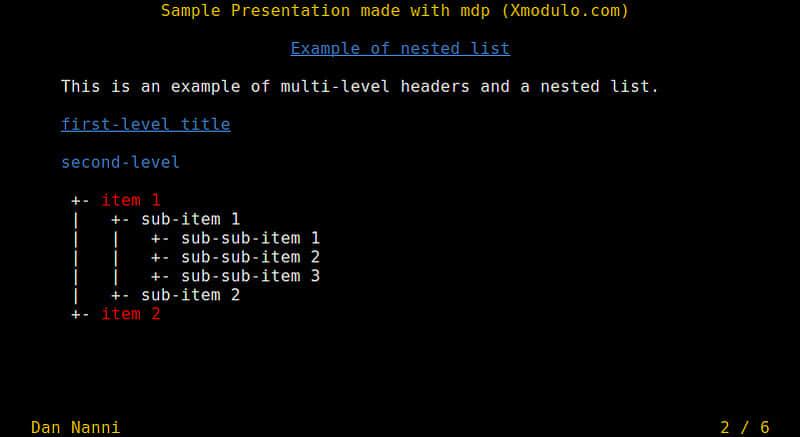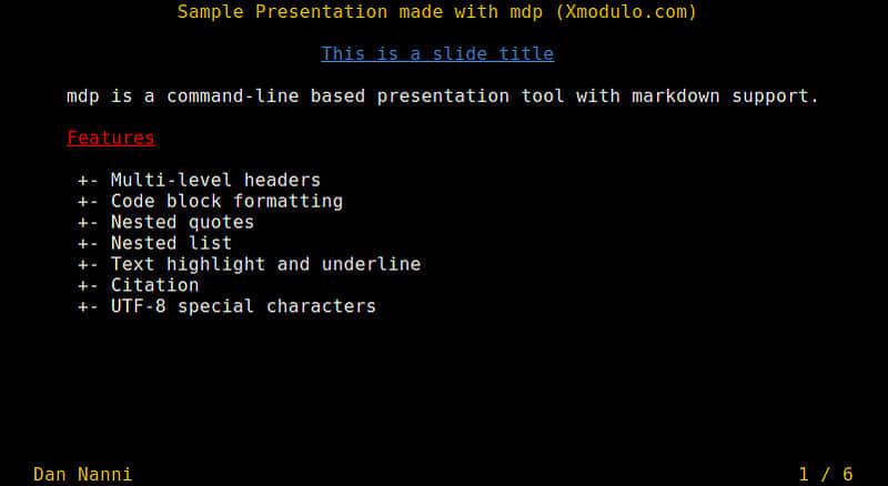%title: Sample Presentation made with mdp (Xmodulo.com) %author: Dan Nanni %date: 2015-01-28 -> This is a slide title <- ========= -> mdp is a command-line based presentation tool with markdown support. <- *_Features_* * Multi-level headers * Code block formatting * Nested quotes * Nested list * Text highlight and underline * Citation * UTF-8 special characters ------------------------------------------------- -> # Example of nested list <- This is an example of multi-level headers and a nested list. # first-level title second-level ------------ - *item 1* - sub-item 1 - sub-sub-item 1 - sub-sub-item 2 - sub-sub-item 3 - sub-item 2 ------------------------------------------------- -> # Example of code block formatting <- This example shows how to format a code snippet. 1 /* Hello World program */ 2 3 #include <stdio.h> 4 5 int main() 6 { 7 printf("Hello World"); 8 return 0; 9 } This example shows inline code: `sudo reboot` ------------------------------------------------- -> # Example of nested quotes <- This is an example of nested quotes. # three-level nested quotes > This is the first-level quote. >> This is the second-level quote >> and continues. >>> *This is the third-level quote, and so on.* ------------------------------------------------- -> # Example of citations <- This example shows how to place a citation inside a presentation. This tutorial is published at [Xmodulo](http://xmodulo.com) You are welcome to connect with me at [LinkedIn](http://www.linkedin.com/in/xmodulo) Pretty cool, huh? ------------------------------------------------- -> # Example of UTF-8 special characters <- This example shows UTF-8 special characters. ae = ä, oe = ö, ue = ü, ss = ß alpha = ?, beta = ?, upsilon = ?, phi = ? Omega = ?, Delta = ?, Sigma = ? ??????????? ?rectangle? ???????????