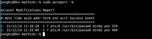 一旦定义审计规则后,它会自动运行。过一段时间后,我们可以看看auditd是如何帮我们跟踪审计的。