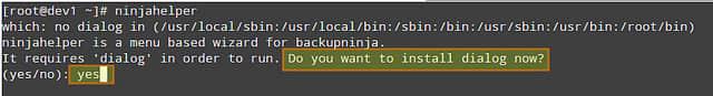 当我们尝试启动 ninjahelper 时,我们可以看到可能需要一个内部依赖程序。假如系统进行了提示,请输入 “yes” 并敲下回车键来安装 dialog(一个用于从 shell 脚本中显示友好对话框的工具)。