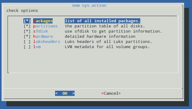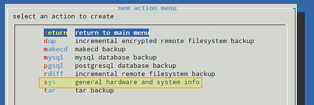 一旦你完成了上面的步骤,按 OK 选项来继续。接着你将能够选择是愿意使用默认的配置文件(/etc/backup.d/10.sys)来完成这次备份操作,还是创建一个新的配置文件。若为后者,一个含有与默认配置文件内容相同的文件将会在相同的目录下被创建,但它被命名为 11.sys,后续的备份操作将会创建类似的文件(注:只不过命名的序号不同)。需要说明的是一旦这个新的配置文件被创建,你便可以使用你喜爱的文本编辑器来编辑该文件。