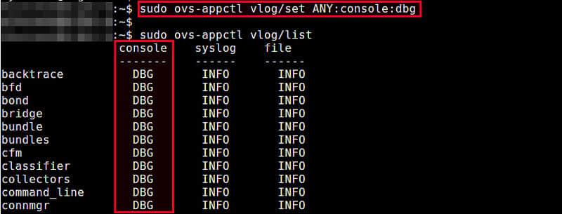 $ sudo ovs-appctl vlog/set ANY:console:dbg