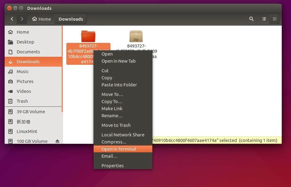 3、右键点击解压后的文件夹,选择 “在终端中打开” 到此文件夹下。