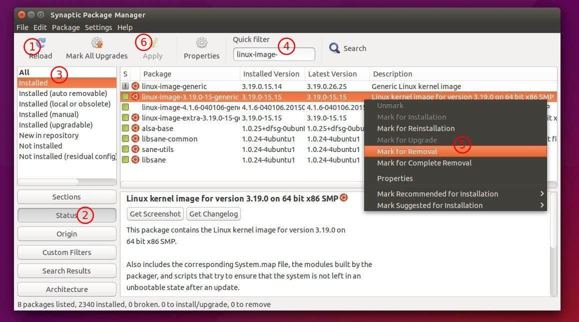 - 选择一个内核镜像 “linux-image-x.xx.xx-generic” 然后将其标记为removal(或者Complete Removal)