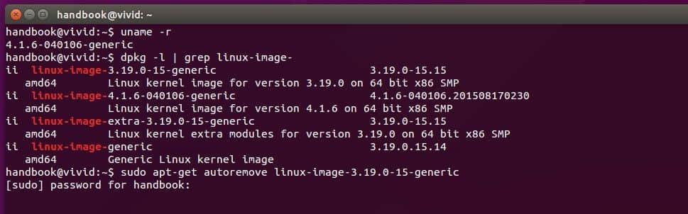 uname -r dpkg -l | grep linux-image- sudo apt-get autoremove KERNEL_IMAGE_NAME