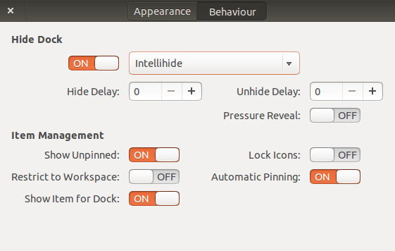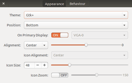 如你所见,Preferences 窗口包含两个标签:Apperance 和 Behavior,前者是默认选中的。Appearance 标签栏包含 Plank 主题相关的设置,dock 的位置,对齐,还有图标相关的,而 Behavior 标签栏包含 dock 本身相关的设定。