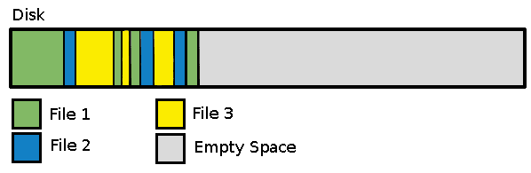 在像 FAT 和 FAT32 这类文件系统中,文件紧挨着写入到磁盘中。文件之间没有空间来用于增长或者更新: