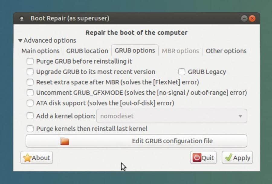 多亏了 Boot Repair 应用,只需要点击按钮,Grub 2 许许多多的问题都能轻易解决。这个漂亮小巧的应用有一个直观的用户界面,可以扫描并识别多种硬盘布局和分区方案,还能发现并正确识别安装在其中的操作系统。这个应用可以处理传统计算机里的 主引导记录 (MBR),也可以处理新型 UEFI 计算机中的 GUID 分区表 (GPT)。