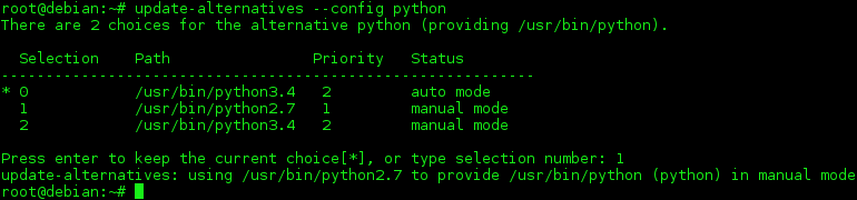 # update-alternatives --install /usr/bin/python python /usr/bin/python2.7 1 update-alternatives: using /usr/bin/python2.7 to provide /usr/bin/python (python) in auto mode # update-alternatives --install /usr/bin/python python /usr/bin/python3.4 2 update-alternatives: using /usr/bin/python3.4 to provide /usr/bin/python (python) in auto mode