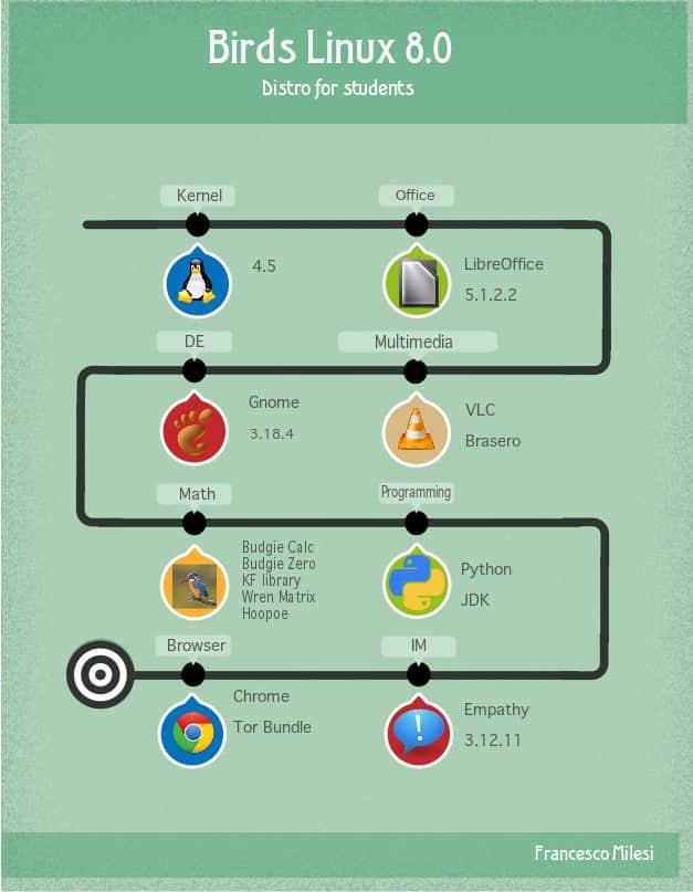 - 面向学生的发行版 Birds Linux 8.0 发布,其搭载了 Linux 4.5 内核,以及 LibreOffice 5.1.2 办公套件,浏览器使用 Chrome 50 和 Tor Browser 5.5.5,还包括 VLC Media Player 2.2.2, GIMP 2.8.14-r1, Empathy 3.12.11, QCAD 3.14.3, 以及 DrJava 20140826-r5761。不过,目前 Birds Linux 8.0 只支持64位机。