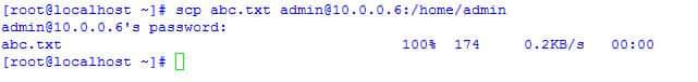[root@localhost ~]# scp importantfile admin@10.0.0.6:/home/admin/ The authenticity of host '10.0.0.6 (10.0.0.6)' can't be established. RSA key fingerprint is SHA256:LqBzkeGa6K9BfWWKgcKlQoE0u+gjorX0lPLx5YftX1Y. RSA key fingerprint is MD5:ed:44:42:59:3e:dd:4c:12:43:4a:89:b1:5d:bd:9e:20. Are you sure you want to continue connecting (yes/no)? yes Warning: Permanently added '10.0.0.6' (RSA) to the list of known hosts. admin@10.0.0.6's password: importantfile 100% 0 0.0KB/s 00:00 [root@localhost ~]#
