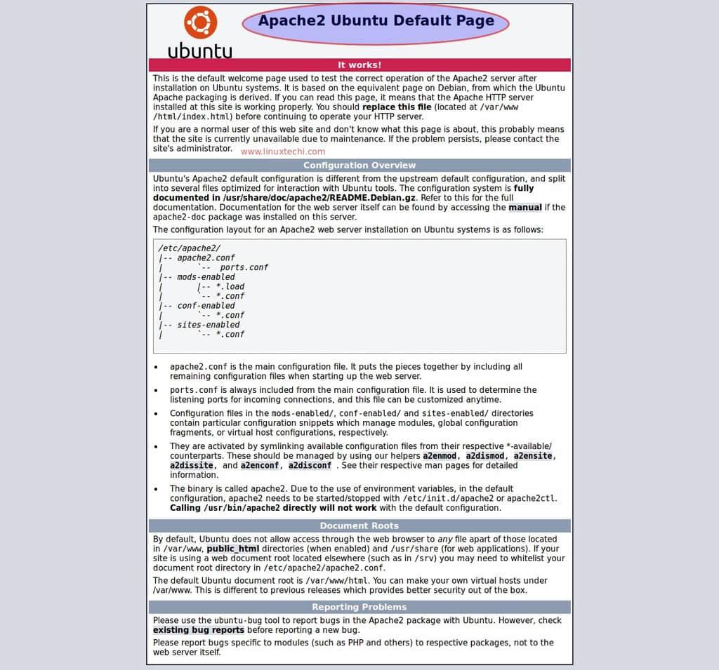 linuxtechi@ubuntu:~$ sudo systemctl start apache2.service linuxtechi@ubuntu:~$ sudo systemctl enable apache2.service linuxtechi@ubuntu:~$ sudo systemctl status apache2.service
