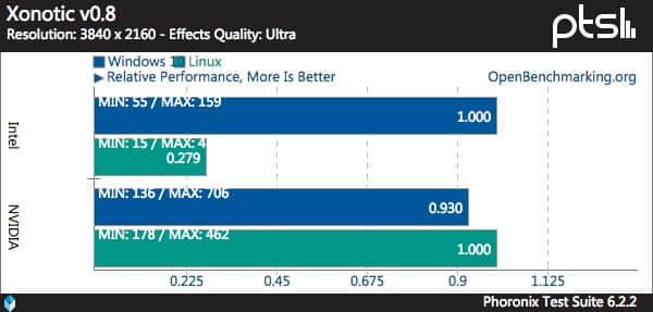 《Xonotic》是一个开源的跨平台第一人称视角的射击游戏,在 Linux 下的 Intel 驱动的性能差的令我们吃惊,不过其它的驱动看起来还好。我们考虑这里肯定有一些需要特定优化的地方。
