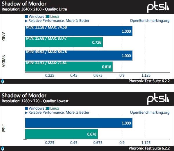 《 中土世界:暗影魔多 》的 Linux 下的性能要比其它的 Linux 游戏稍好一些,但是仍然不能同 Windows 下的相比。
