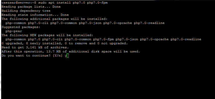 9、 在你的服务器控制台里输入下面的命令来获取 PHP7.0 和扩展包,这能够让 PHP 与 Nginx 网络服务进程通信。