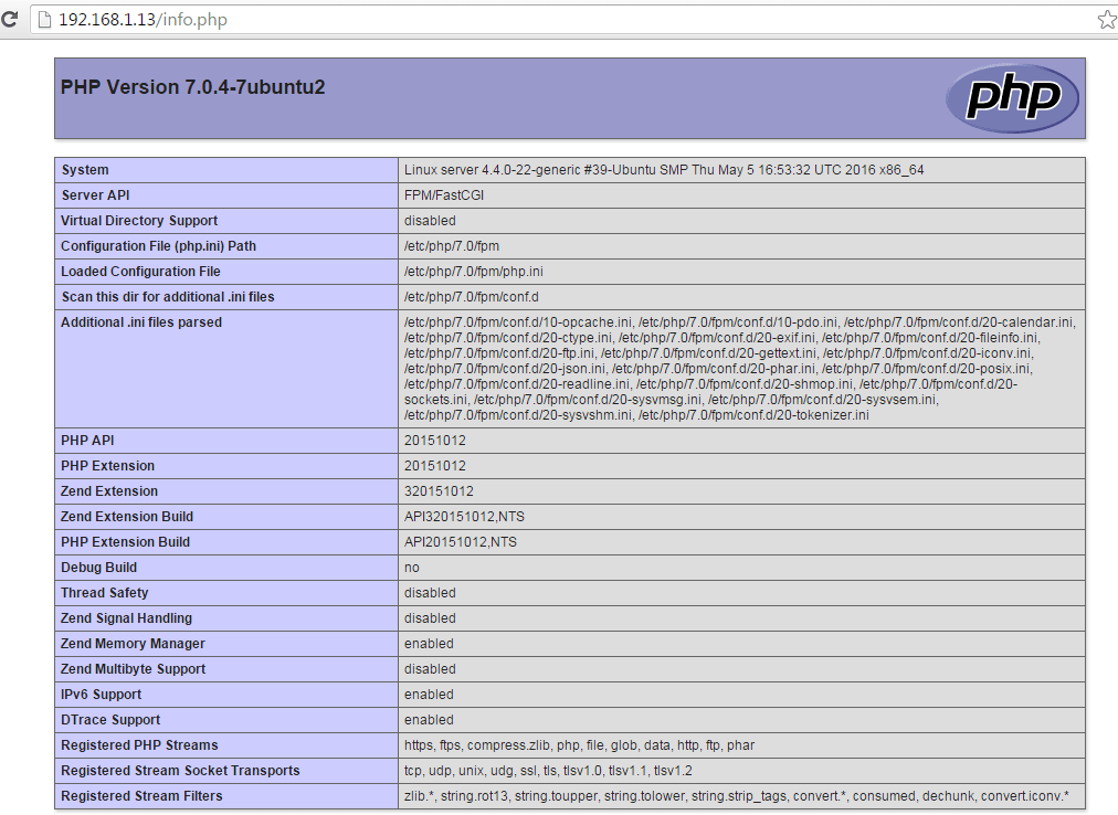 12、 要测试启用了 PHP-FPM 的 Nginx 服务器,用下面的命令创建一个 PHP 测试配置文件 info.php。接着用 http://IP_or domain/info.php 这个网址来查看配置。