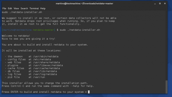 当所有需要的软件包都安装好了,你就 cd 到 netdata/ 目录,运行 netdata-installer.sh 脚本。